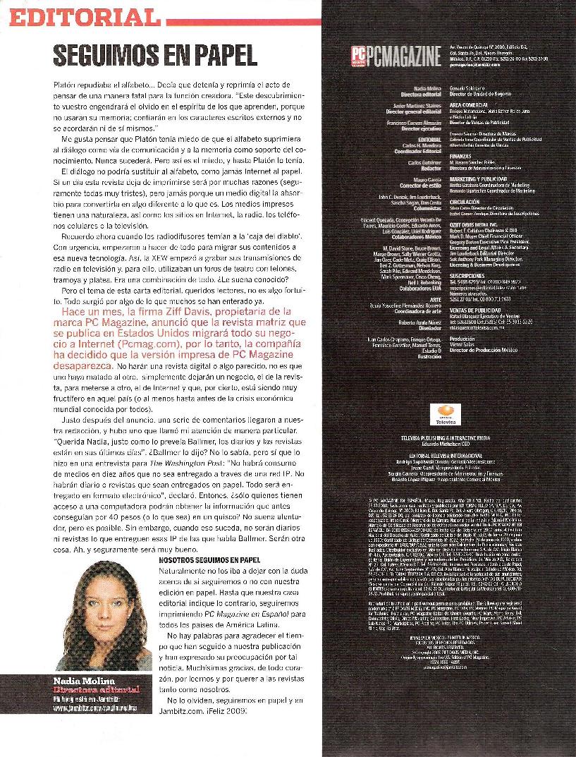 Regresando a la revista… El articulo principal, me dejo mucho que desear, pero en cambio un artículo titulado “Richard Stallman” {pag. 79}, me agrado (espero hablar más de ello en algún post). Así continúe leyendo, y sin darme cuenta llegue a la sección de EDITORIAL Subtitulada: SEGUIMOS EN PAPEL. Y es aquí donde me entero (apenas ¬¬) que la firma Ziff Davis propietaria de marca PC MAGAZINE anuncio que la revista matriz “la de estados unidos” dejaría de ser impresa para convertirse totalmente en medio electrónico (pcmag.com) {esperemos que no sea una broma de los santos inocentes}