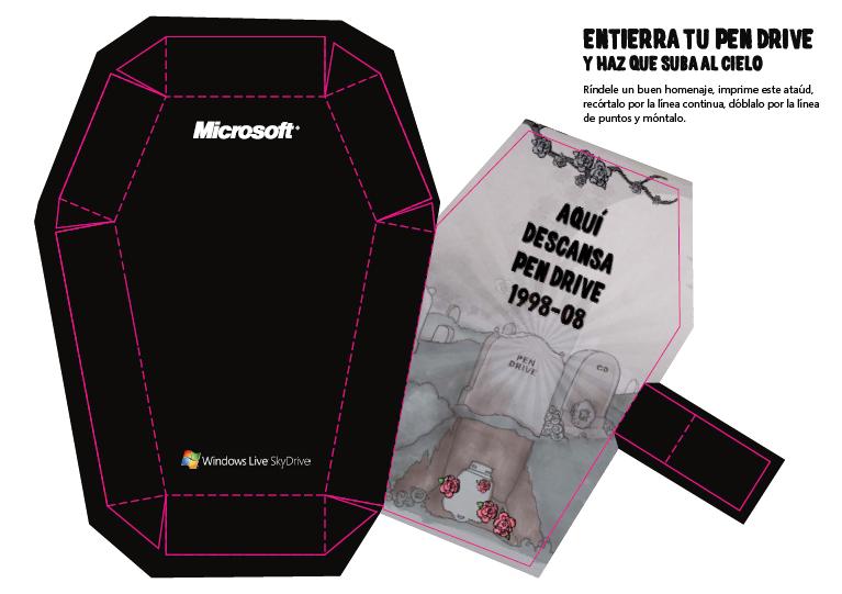 Navegando de aquí para aca encontré un anuncio de SkyDrive ; nunca me pregunte por que tenía ese nombre hasta que vi esta pagina:http://www.vivelive.com/skydrive/ , y asi es como de una forma divertida le dices adiós a tu memoria USB (Pen Dirve). Puedes hacerle un bonito ataúd a tu memoria USB y sumar en el contador de GB enterrados.