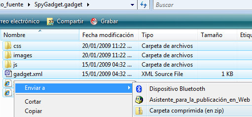 Para convertir todos nuestros archivos a un instalador de gadget es tan facil como seleccionar todos los archivos y enviarlos a una carpeta comprimida, una vez hecho esto seleccionamos el archivo ZIP y lo renombramos con la extencion *.gadget
