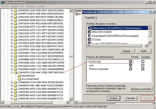 4.- Buscar las claves del registro (En el editor de registro –> Menú Edición –> Buscar…) que aparecen en nuestro archivo LOG y cambiarles los permisos (Botón secundario->Permisos..)