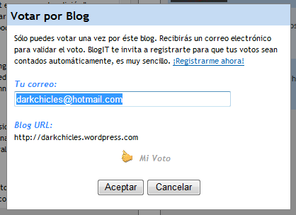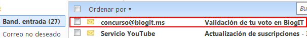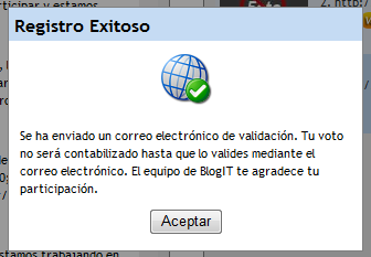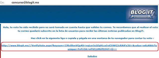 Una vez que tu registro de voto ha sido exitoso, espera unos minutos y revisa tu correo electrónico TE LLEGARA UN MAIL DE concurso@blogit.ms con el asunto Validación de tu voto en BlogIT [SI VEZ QUE NO TE LLEGA EL MAIL REVISA TU CORREO NO DESEADO]