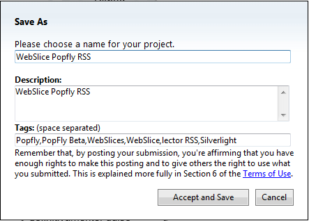 Con esto terminamos la primera parte de nuestro WebSlice Popfly RSS en el siguiente post crearemos el WebSlice que se unirá con el Mashup que acabamos de guardar.