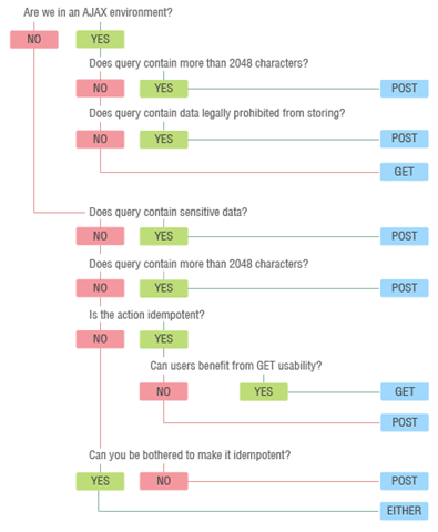 Aunque una vez que se entiende esta diferencia, nos surge la pregunta de ¿Cuando usar POST y cuando usar GET?, si al final hacen lo mismo. Pues bien en el twitter recomendaban este enlace The Definitive Guide to GET vs POST y aunque el texto del autor me pareció un poco confuso, su imagen dice mas que mil palabras y me parece que esta perfectamente bien estructurada.