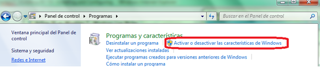 3.-Ahora damos clic en Activar o desactivar las características de Windows