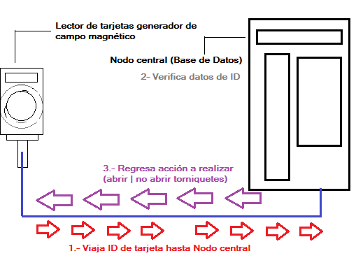 El lector a su vez esta conectado a un nodo centralizado (base de datos central) donde se asocia la ID de la tarjeta con los diferentes datos de la misma ( crédito/saldo de la tarjeta, lugar, hora , etc… ) en el caso de que el lector sea una terminal de torniquete; el sistema validara que se cuente con el saldo suficiente para realizar el viaje si es así restara saldo de su tarjeta y permitirá el movimiento de los torniquetes dando acceso al usuario de lo contrario mandare un aviso y no permitirá el acceso.