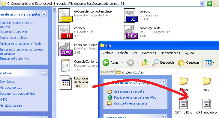 Seleccionamos el archivos libconio.a y lo copiamos al directorio: C:\Dev-Cpp\lib