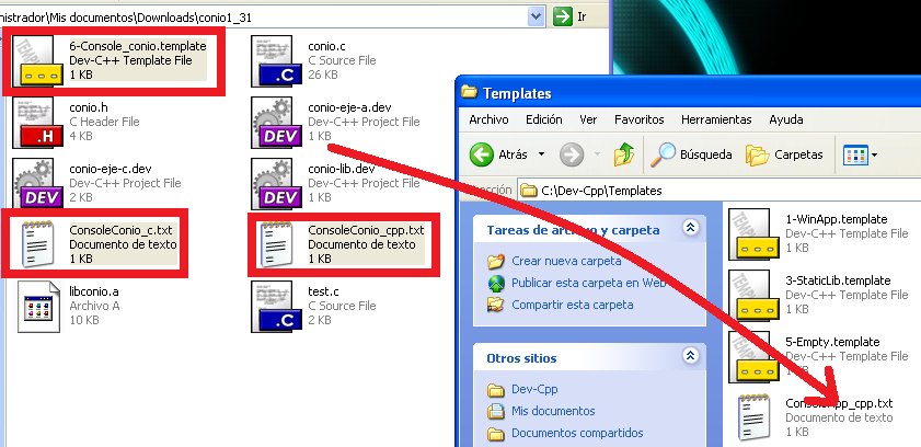 Seleccionamos los archivos 6-Console_conio.template , ConsoleConio_c.txt y ConsoleConio_cpp.txt y los copiamos en la carpeta C:\Dev-Cpp\Templates