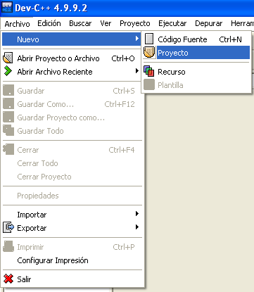 Abrimos Dev-C++ : Archivo –> Nuevo –> Proyecto